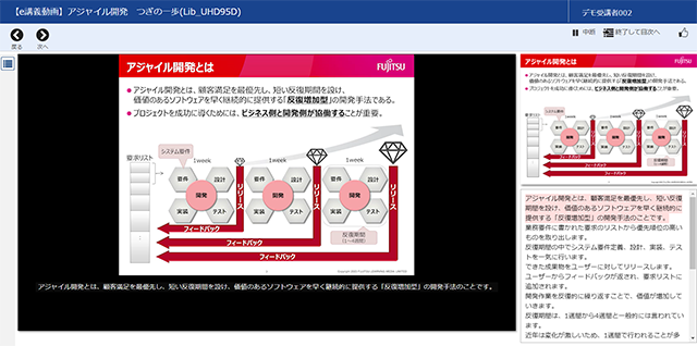 再生スピード変更や講師の語りの文字テキスト表示や、全コースの中から必要なシーンだけのピンポイント検索などができます。
