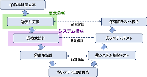 右図はシステム開発プロジェクトにおける、開始から終了までの開発工程の流れを表したものです。