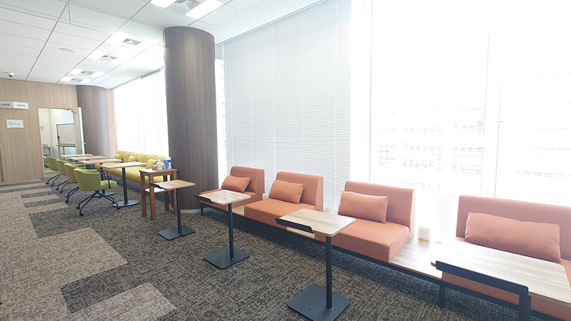 休憩時間には明るく開放的なラウンジでおくつろぎください。(充電も可能です)