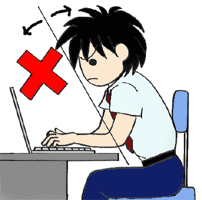 キーボードをたたくときに肩が上がっていないか気を付けてください。イスを高くしてみるのもいいでしょう。ただし、背が低い人ではあまりイスを高くすると、今度は足が床に付かなくなります。そうすると、太股は足という「おもり」をぶら下げることになり、圧迫されて血行が悪くなり、結果として太股がしびれたりひざが痛くなったりします。足が浮くなら下に台を置いてみてください。 |