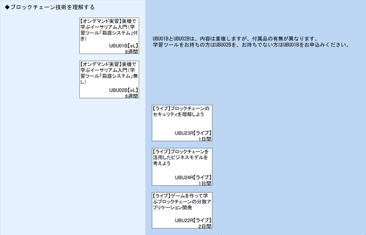 ◆ブロックチェーン技術を理解する\nUBU01BとUBU02Bは、内容は重複しますが、付属品の有無が異なります。 【オンデマンド実習】実機で学ぶイーサリアム入門(学習ツール「箱庭システム」付き) 【オンデマンド実習】実機で学ぶイーサリアム入門(学習ツール「箱庭システム」無し) 【ライブ】ブロックチェーンのセキュリティを理解しよう 【ライブ】ブロックチェーンを活用したビジネスモデルを考えよう 【ライブ】ゲームを作って学ぶブロックチェーンの分散アプリケーション開発