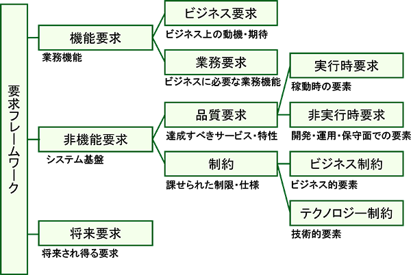 このうち、非機能要求は性能要件や可用性要件など顧客が潜在的に持っている品質要件で、要求の明確化が困難であるため、受注ベンダー側のほうから積極的に提案する必要があります。