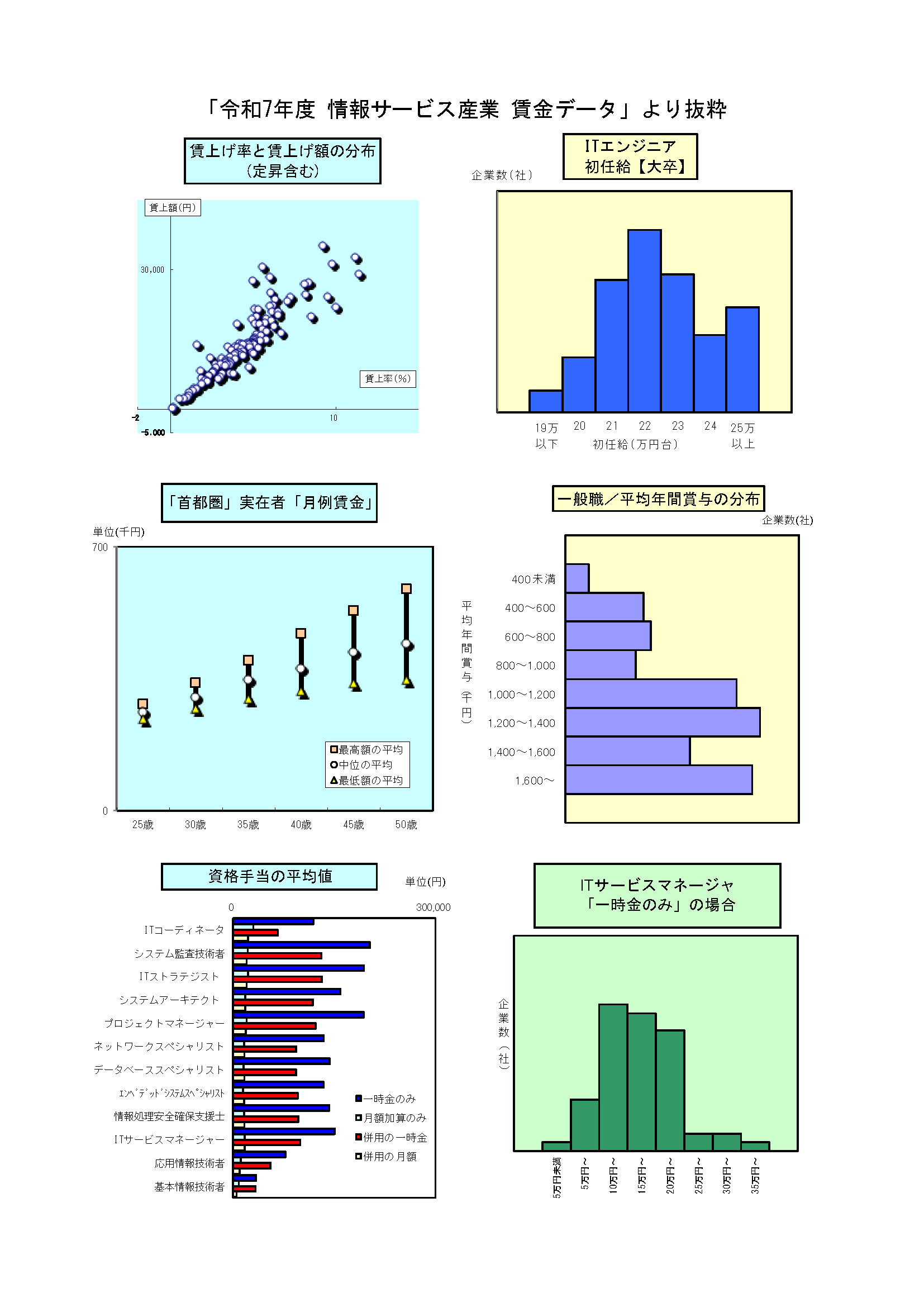「情報サービス産業 賃金データ」では、賃上げ状況・初任給・年齢別地域別実在者賃金(月例給与・賞与)・資格手当等、会員企業の賃金の状況に関するデータをまとめております。