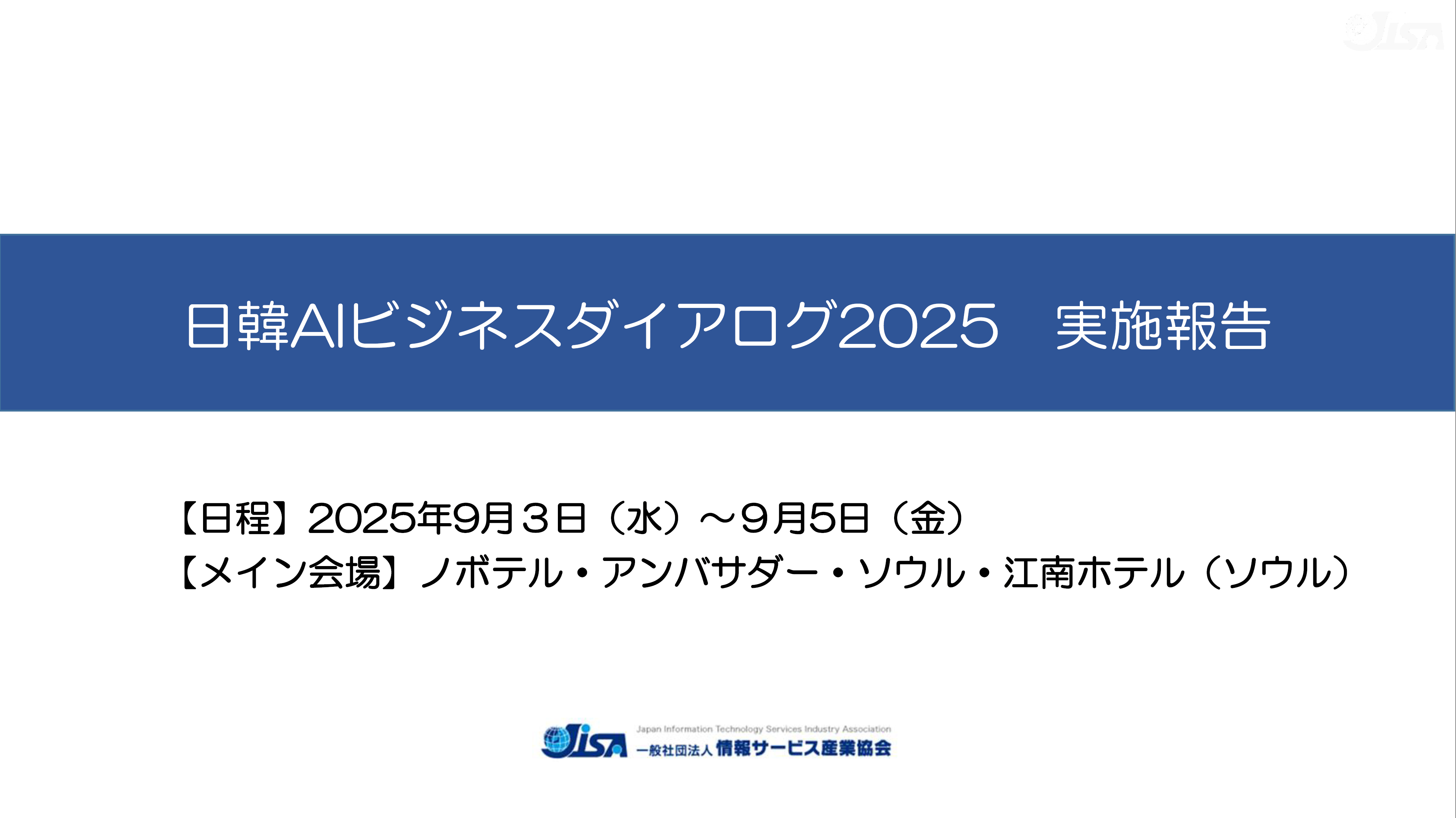 本年9月、ソウルにて「日韓AIビジネスダイアログ2025」を開催いたしました。JISAと韓国情報産業連合会(FKII)による長年の交流を基盤に、双方向の意見交換を重視した新しい形式で実施し、両国のAI・デジタル分野における最新動向について活発な議論が行われました。
