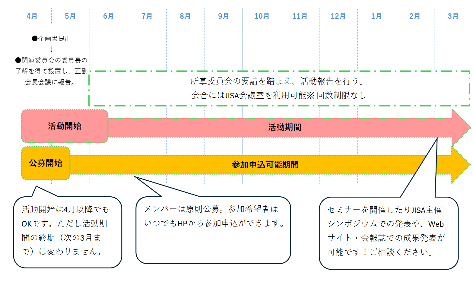 活動はJISAの事業年度と同様、年度単位とし、幹事及び事務担当責任者を中心に自主的に行います。