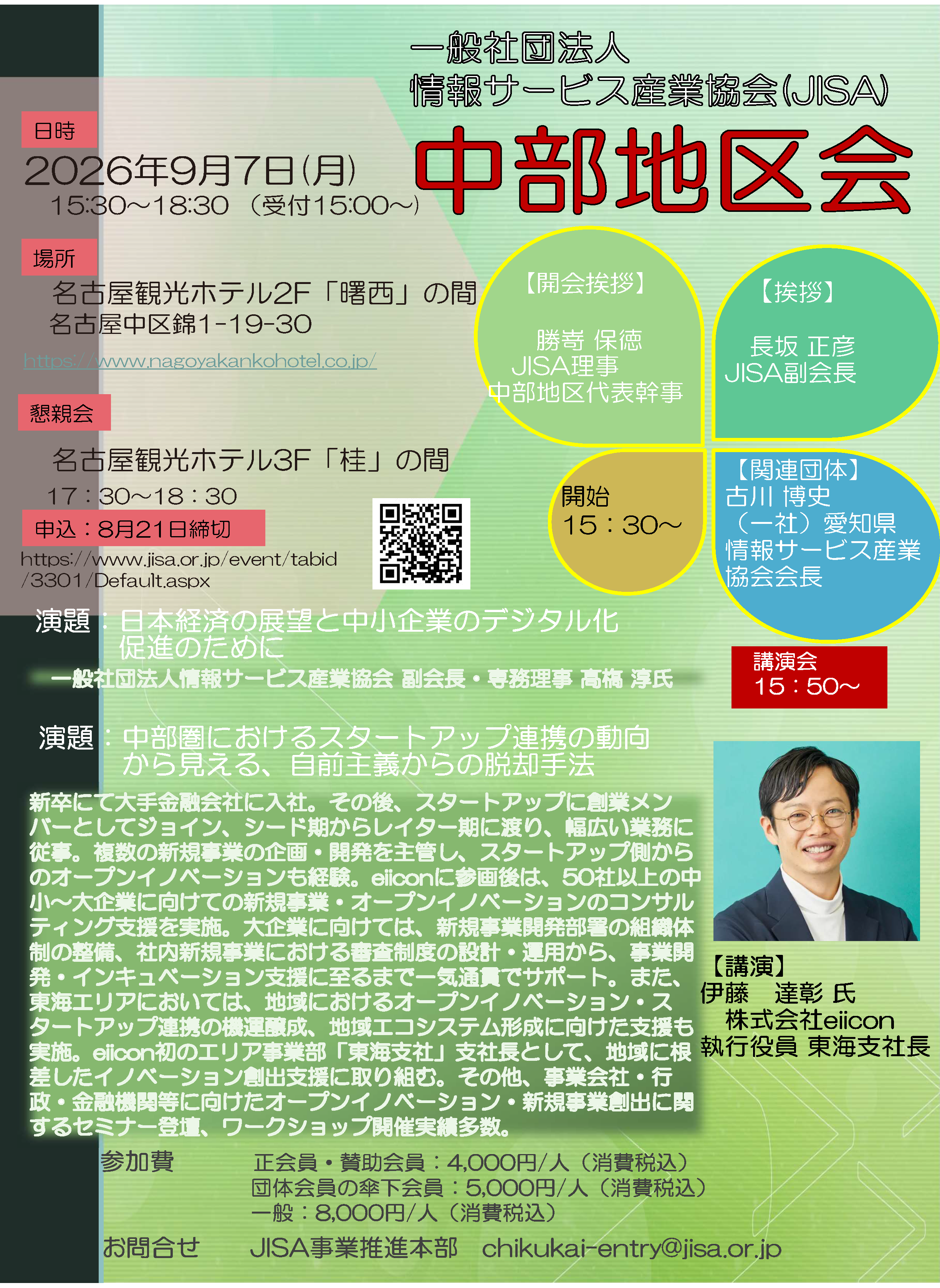 当日は、JISA副会長・専務理事の髙𣘺 淳氏(2018年~2020年 経済産業省 中部経済産業局長)に、日本経済の展望と中小企業のデジタル化促進について、ご講演いただきます。また、「中部圏におけるスタートアップ連携の動向から見える、自前主義からの脱却手法」をテーマに、伊藤 達彰氏(株式会社eiicon 執行役員 東海支社長 地域イノベーション推進本部 本部長 アライアンス推進室管掌役員)をお招きいたします。講演後は懇親会を開催する運びです。